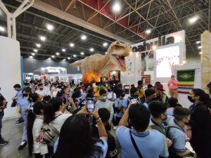 11 octubre 2022; Monterrey, N.L.- Desde el inicio de la Feria Internacional del Libro de Monterrey el pasado sábado, el Pabellón de Coahuila ha sido el más visitado, debido a la experiencia que se llevan los visitantes no sólo por el Carnotaurus robotizado que se encuentra en él y que mide 4 metros de altura por 11 de largo, sino también por sus 200 metros cuadrados de exhibición, en los que los visitantes pueden disfrutar de la producción editorial, su área de exhibición de vinos de Coahuila, la exposición de Sarapes y el telar que se encuentran en él, así como el área para charlas y presentaciones de libros, con la fachada del emblemático edificio del Ateneo Fuente de Saltillo.