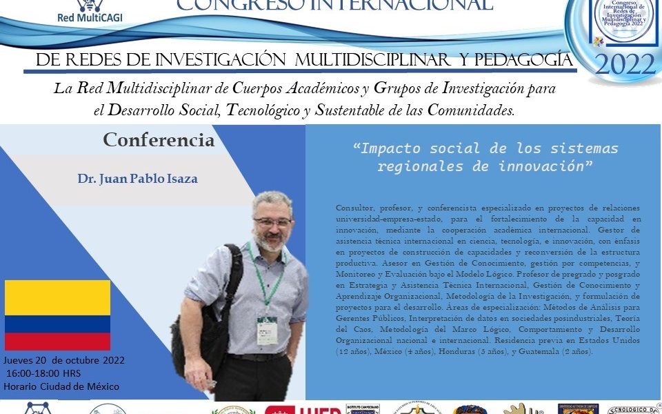 Asimismo, la ponencia “Impacto social de los sistemas regionales de innovación” por Juan Pablo Isaza, Profesor e Investigador del Departamento de Derecho, Universidad del Norte, Colombia; a las 17:00 horas la conferencia “El Enfoque de Innovación para la Investigación e intervención en Trabajo Social” con el maestro Elí Evangelista Martínez.