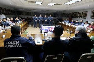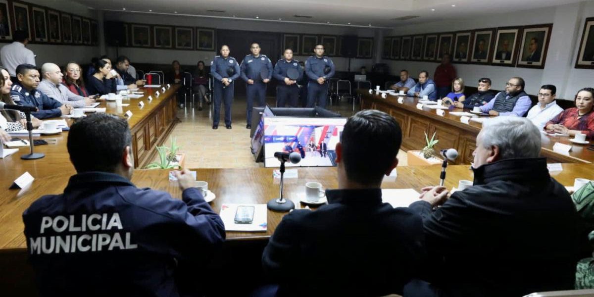Durante la reunión de coordinación, Chema Fraustro Siller reconoció a cuatro elementos de la Policía Municipal quienes hace unos días abordaron y brindaron los primeros auxilios a un automovilista que sufrió un infarto, labor que fue importante para salvarle la vida.
