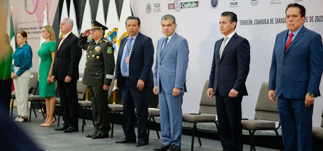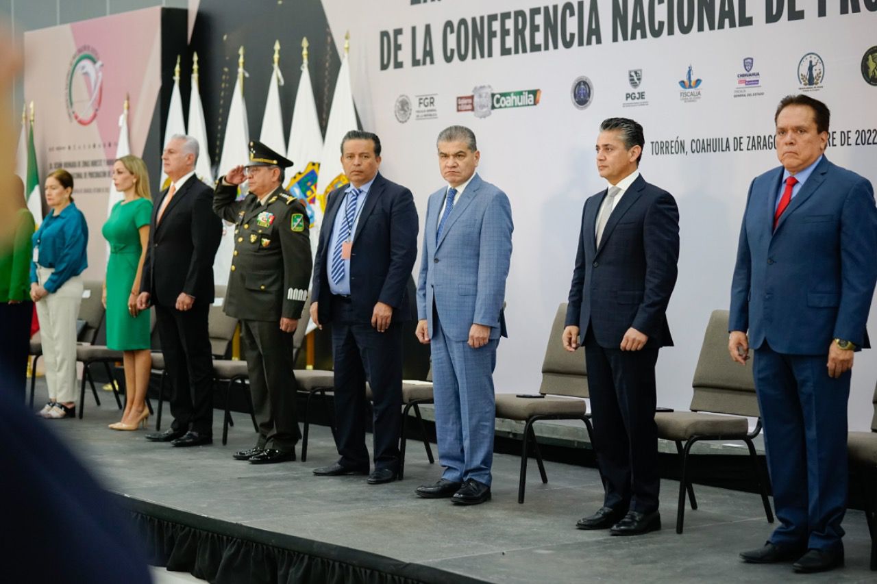 15 octubre 2022; Torreón, Coahuila.- En la ceremonia con la que se inauguró la Segunda Sesión Ordinaria de Zonas Noreste y Noroeste de la Conferencia Nacional de Procuración de Justicia, el gobernador Miguel Ángel Riquelme Solís señaló que la principal estrategia que tiene Coahuila es la coordinación con el Ejército Mexicano y con la Guardia Nacional.