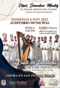 26 octubre 2022; San Pedro, Coahuila.-La Administración Municipal en coordinación con la Casa de la Cultura, te invita a la presentación del mejor arpista del mundo, el virtuoso sampetrino, Cesar Secundino Méndez.