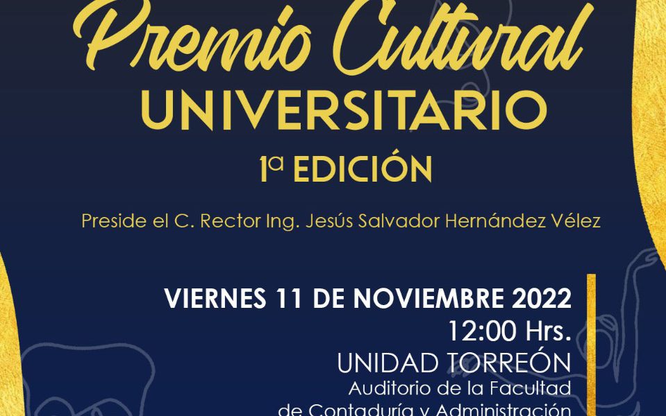 09 noviembre 2022; Saltillo, Coahuila.- Como parte de los festejos por el 65 aniversario de la Universidad Autónoma de Coahuila, la Coordinación General de Difusión y Patrimonio Cultural, llevará a cabo la entrega de reconocimientos a los ganadores del Primer Premio Cultural Universitario en la Unidad Saltillo, Torreón y Norte.