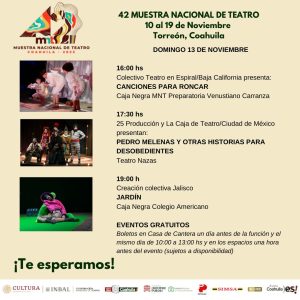 14 noviembre 2022; Torreón, Coahuila.- El Gobierno del Estado de Coahuila, a través de su Secretaría de Cultura y en coordinación con el Ayuntamiento de Torreón (a través del Instituto Municipal de Cultura y con la Coordinación Nacional de Teatro del INBAL), invitan a la presentación de las actividades de la 42 Muestra Nacional de Teatro.