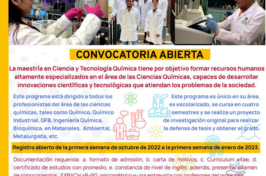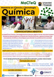 15 noviembre 2022; Saltillo, Coahuila.-La Facultad de Ciencias Químicas de la Universidad Autónoma de Coahuila convoca a egresados y profesionistas del área de las Ciencias Químicas como Químico, Químico Industrial, QFB, Ingeniería Química, Bioquímica en materiales, entre otros, a cursar la maestría en Ciencia y Tecnología Química.