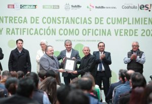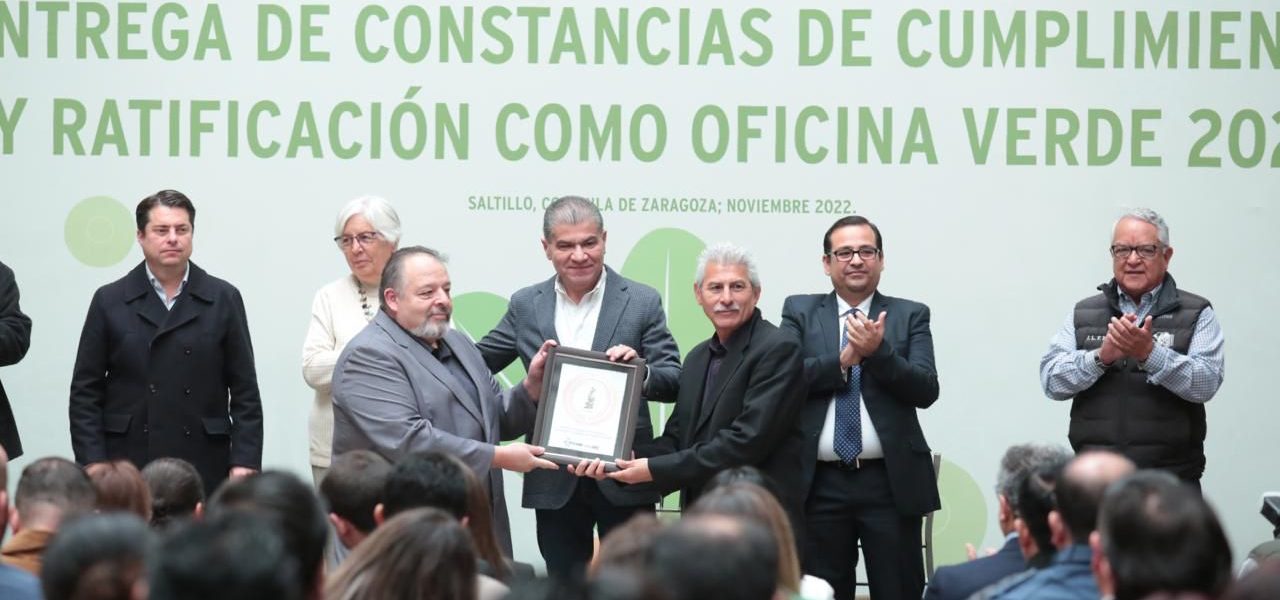 24 noviembre 2022; Saltillo, Coahuila.-En Coahuila se cuida y protege el medio ambiente, además que se refuerzan las acciones de sustentabilidad, por lo cual, el Gobernador Miguel Ángel Riquelme Solís, efectuó la entrega de Constancias de Cumplimiento y Ratificaciones como Oficinas Verdes 2022.