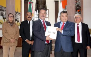 El servidor público estatal entregó el documento al Presidente de la Junta de Gobierno, diputado Eduardo Olmos Castro, y al Presidente de la Mesa Directiva, diputado Francisco Javier Cortez Gómez.