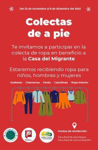 25 noviembre 2022; Saltillo, Coahuila.- La Facultad de Psicología y la Facultad de Ciencias de la Comunicación de la Universidad Autónoma de Coahuila, en conjunto con la organización comunitaria Psicólogos de a Pie, invitan a la comunidad universitaria y público en general a sumarse a “Colectas de a pie” en apoyo a la Casa del Migrante de Saltillo.