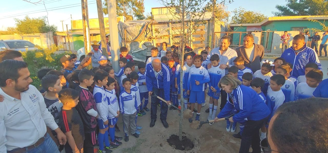 30 noviembre 2022; Monclova, Coahuila.-El campo de futbol de la colonia Veteranos de la Revolución, al oriente de la ciudad, se vestirá de verde, luego que la presidencia municipal, a través del departamento de Forestación, iniciara ayer, con la siembra de 15 encinos,