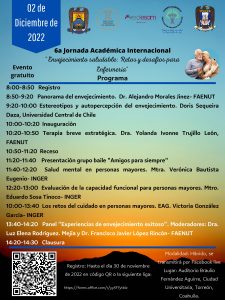 30 noviembre 2022; Torreón, Coahuila.-La Facultad de Enfermería Unidad Torreón (FAENUT) de la Universidad Autónoma de Coahuila, a través de su Cuerpo Académico Enfermería Geronto Geriátrica, en conjunto con el Instituto Nacional de Geriatría y la Red Internacional de Enfermería en Salud del Adulto Mayor, invitan a la comunidad universitaria, profesionales de la salud y público en general a participar en la Sexta Jornada Académica Internacional «Envejecimiento saludable: Retos y desafíos para Enfermería», la cual forma parte de la Cuarta Semana Académica y que se llevará a cabo el viernes 2 de diciembre de 8:00 a 14:30 horas en modalidad híbrida.