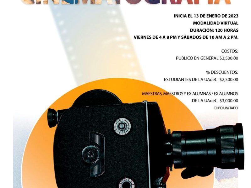 13 diciembre 2022; Torreón, Coahuila.- La Escuela de Artes Escénicas Unidad Torreón de la Universidad Autónoma de Coahuila, en colaboración con la Muestra de Cine Coahuila, invitan a la comunidad universitaria y público en general a participar en el Diplomado en Cinematografía que inicia el próximo 13 de enero de 2023, en modalidad virtual.