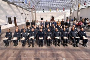 El alcalde, Mario Dávila Delgado, junto con el representante de la Secretaria de Seguridad Pública en el Estado, Sonia Villarreal Pérez, el rector de la Universidad de Policía, José Luis de la Peña Flores, se bizo la entrega de los certificados a los nuevos agentes de Seguridad Pública.