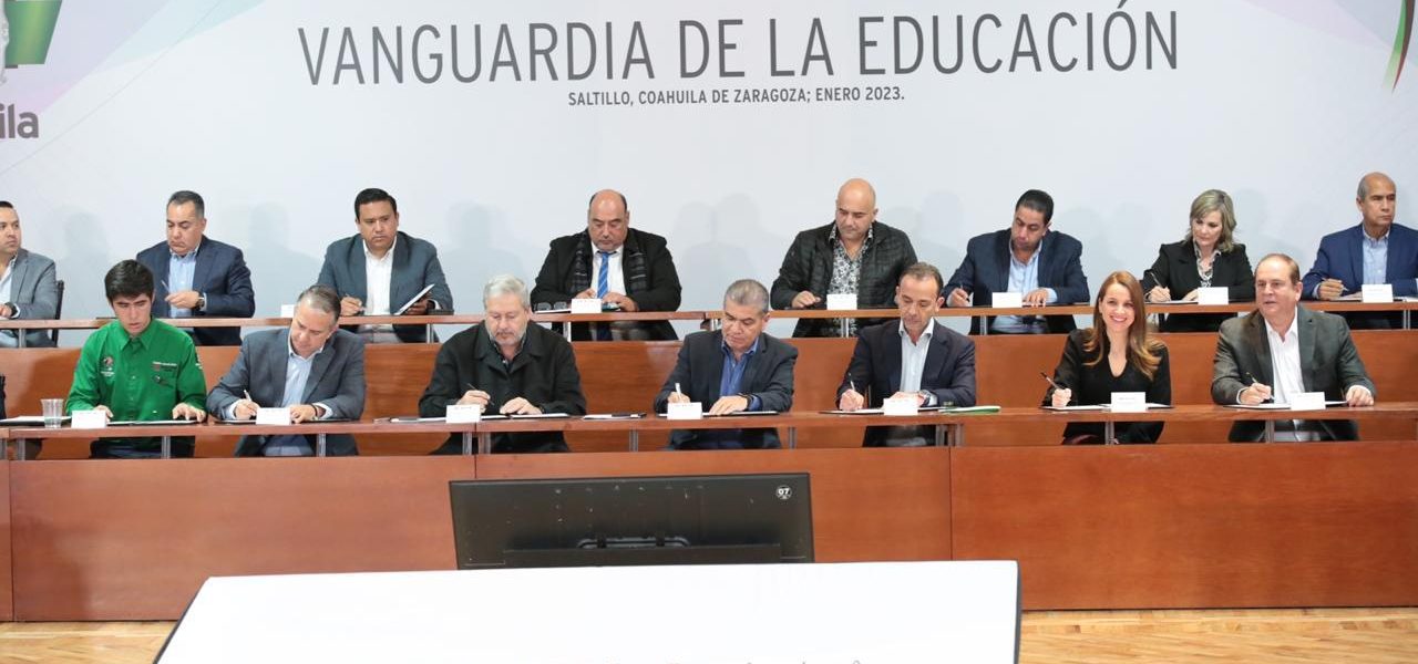 12 enero 2023; Saltillo, Coahuila.- Coahuila se prepara para enfrentar los retos educativos y estar a la vanguardia con las carreras que se necesitan, por lo que el gobernador Miguel Ángel Riquelme Solís efectuó la firma de convenio para llevarlas a cabo en conjunto con los sectores productivos de las cinco regiones del estado.