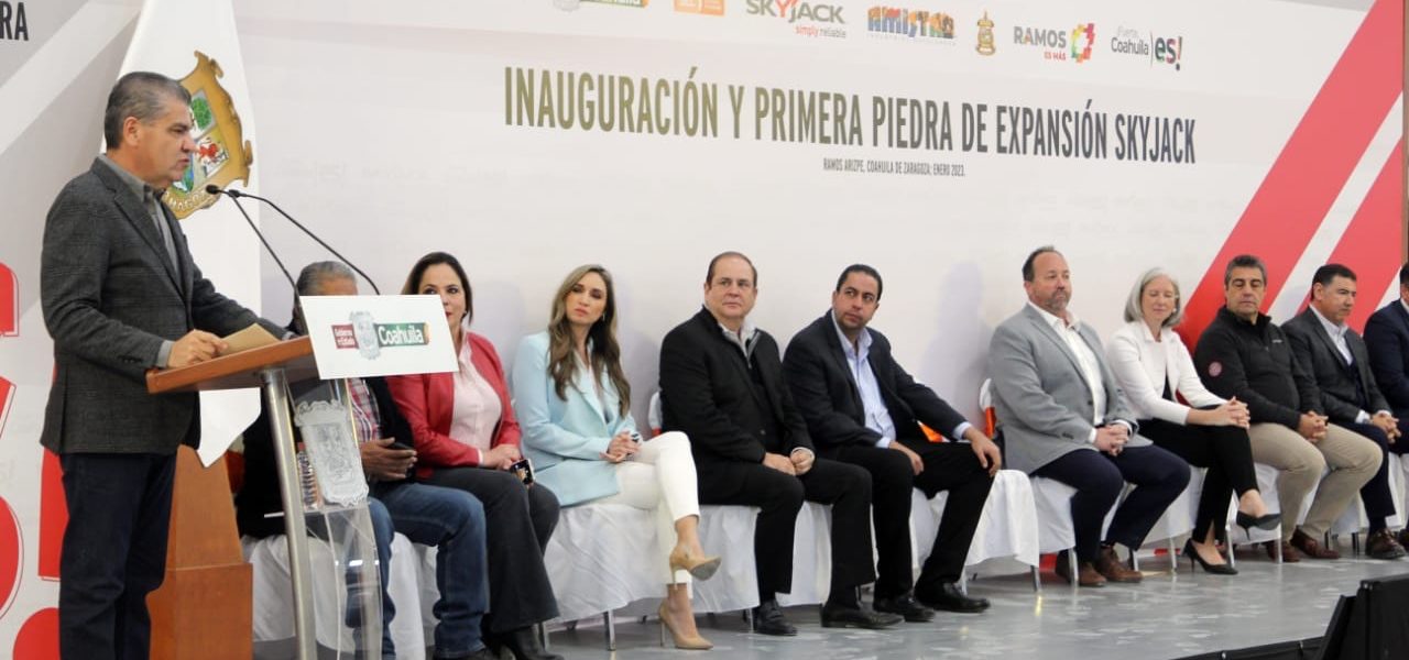 El alcalde José María Morales señaló que el incansable trabajo de promoción económica que ha encabezado el gobernador Miguel Riquelme, aunado a su gran labor por mantener a Coahuila en niveles óptimos de seguridad, estabilidad laboral y social, nuevamente rinde frutos con la inauguración y primera piedra de expansión de la empresa SkyJack en su municipio.