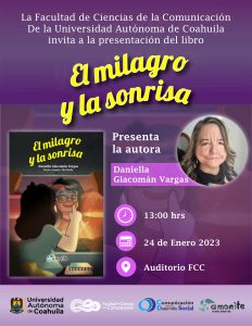 24 enero 2023; Saltillo, Coahuila.- En el marco del día Mundial de concientización sobre el Síndrome de Moebius, la Facultad de Ciencias de la Comunicación de la Universidad Autónoma de Coahuila, invita a la presentación del libro “El milagro y a la sonrisa” de la periodista Daniella Giacomán; hoy 24 de enero a las 13:00 horas en el Auditorio del plantel.