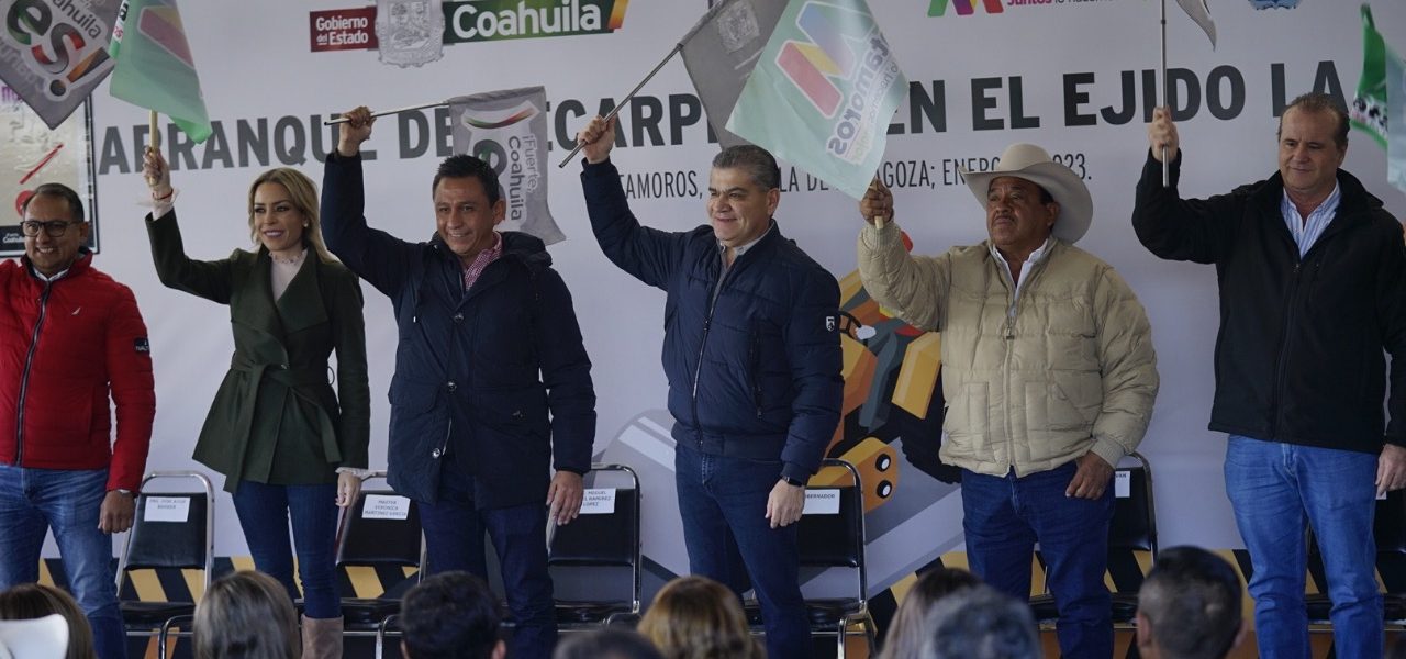 24 enero 2023; Matamoros, Coahuila.- El gobernador Miguel Ángel Riquelme Solís, junto al alcalde Miguel Ángel Ramírez López, dieron el banderazo de arranque de recarpeteo en el Ejido La Purísima, en este municipio, donde la inversión será de 4.5 millones de pesos.