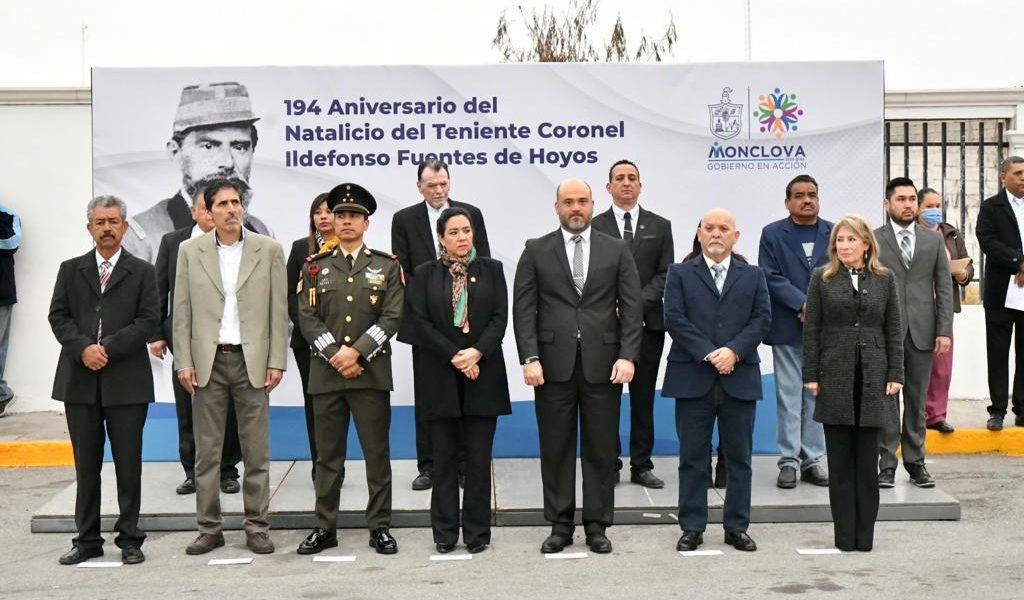 25 enero 2023; Monclova, Coahuila.-Las autoridades municipales, educativas y militares, conmemoraron el 194 aniversario, del Natalicio del coronel Ildefonso Fuentes de Hoyos, la reseña sobre la vida y actividad militar de este personaje histórico estuvo a cargo del cronista de la ciudad y encargado del archivo municipal, Lic. Arnoldo Bermea.