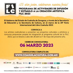 31 enero 2023; Saltillo, Coahuila.- Con motivo de la realización de la 25 Edición de la FILC 2023, se invita a la comunidad artística y literaria a participar en ella a través de las convocatorias emitidas para tal efecto.