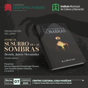 04 febrero 2023; Torreón, Coahuila.-R. Ayuntamiento de Torreón a través del Instituto Municipal de Cultura y Educación invitan al público a la presentación del libro “Entre el susurro de las sombras” de B. J. Hernández, publicado por Cravioto editores, en 2022. La obra se presentará el martes 7 de febrero, en el Centro Cultural Casa Mudéjar (Ildefonso Fuentes 66 sur, Torreón), en punto de las 19:00 hrs. y contará con la participación de Norma Alejandra Montelongo Moreno y Juan Eusebio Valdez Villalobos, además de la autora.