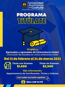 10 febrero 2023; Saltillo, Coahuila.- Para incentivar a los egresados a obtener el título en el nivel superior, la Universidad Autónoma de Coahuila a través del Departamento de Certificación, Títulos y Cédulas de la Dirección de Asuntos Académicos pone en marcha el Programa «Titúlate» del 13 de febrero al 24 de marzo 2023.