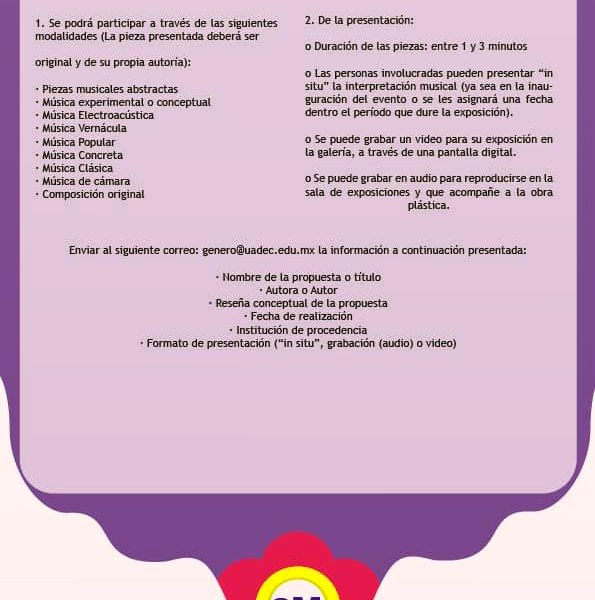 Enviar al correo genero@uadec.edu.mx: nombre de la propuesta o título, autora o autor, reseña conceptual de la propuesta, fecha de realización, institución de procedencia y formato de presentación (“in situ”, grabación de audio o video); para más información visitar el Facebook Coordinación de Igualdad de Género o llamar a los teléfonos (844) 438 1552 y (844) 438 1528.