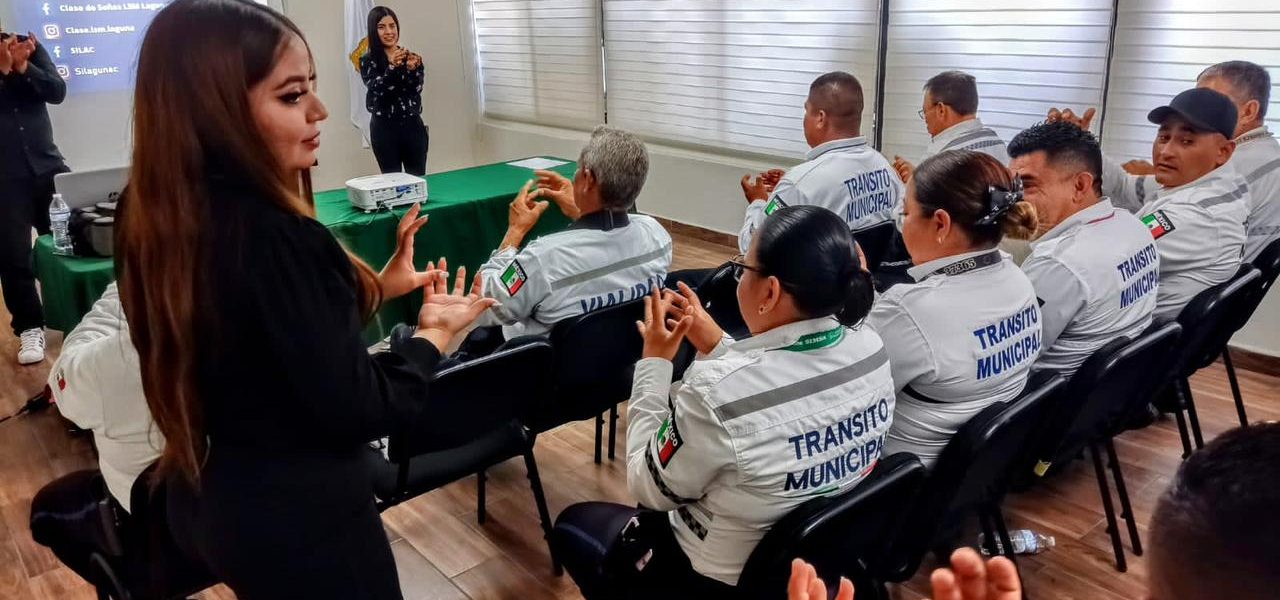 23 febrero 2023; Torreón, Coahuila.-Con el propósito de atender a personas con discapacidad auditiva, un grupo de 30 agentes de vialidad recibió la conferencia impartida por la asociación “Sordos e Intérpretes Laguna” (SILAC).