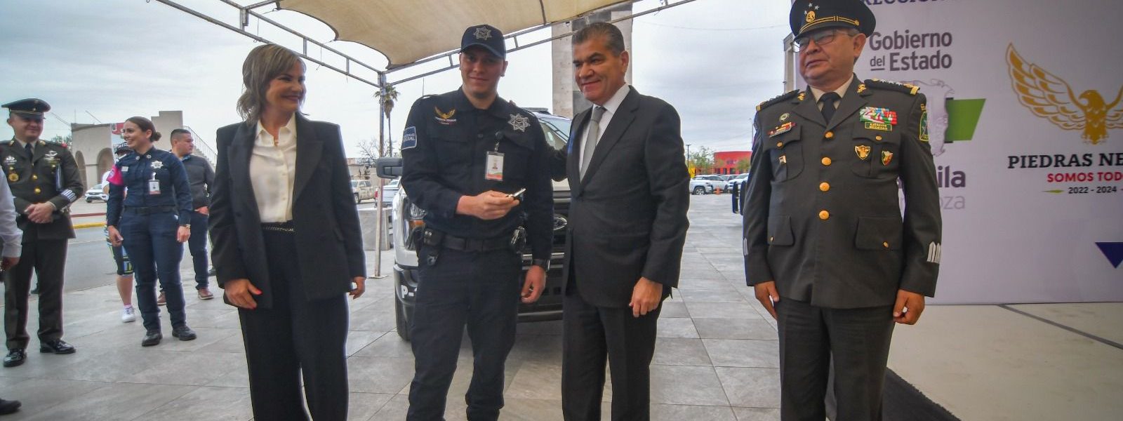 25 febrero 2023; Piedras Negras; Coahuila.- La Presidenta Municipal Norma Treviño Galindo recibió de manos del Gobernador Constitucional del Estado de Coahuila de Zaragoza Miguel Ángel Riquelme Solís la donación de cuatro nuevas patrullas, las cuales se integrarán a las labores de seguridad pública en esta ciudad, tres de ellas como unidades operativas y una como unidad de género.