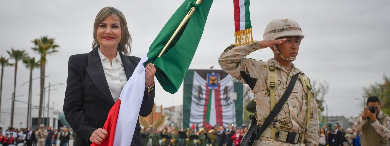 Durante la ceremonia, en la que se realizó el izamiento de la bandera nacional monumental, la más grande del Mundo izada, y se entonó el Himno Nacional Mexicano, se tomó protesta de bandera y se hizo entrega del pabellón nacional a treinta y cinco instituciones educativas de esta frontera.