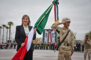 25 febrero 2023; Piedras Negras; Coahuila.-En el marco de la celebración nacional del Día de la Bandera, la Presidenta Municipal Norma Treviño Galindo, participó en la ceremonia de honores al lábaro patrio en el asta bandera monumental de la Gran Plaza, acto cívico que fue encabezado por el Gobernador Constitucional del Estado de Coahuila de Zaragoza Miguel Ángel Riquelme Solís y el General de División Diplomado de Estado Mayor Eufemio Alberto Ibarra Flores, Comandante de la XI Región Militar.