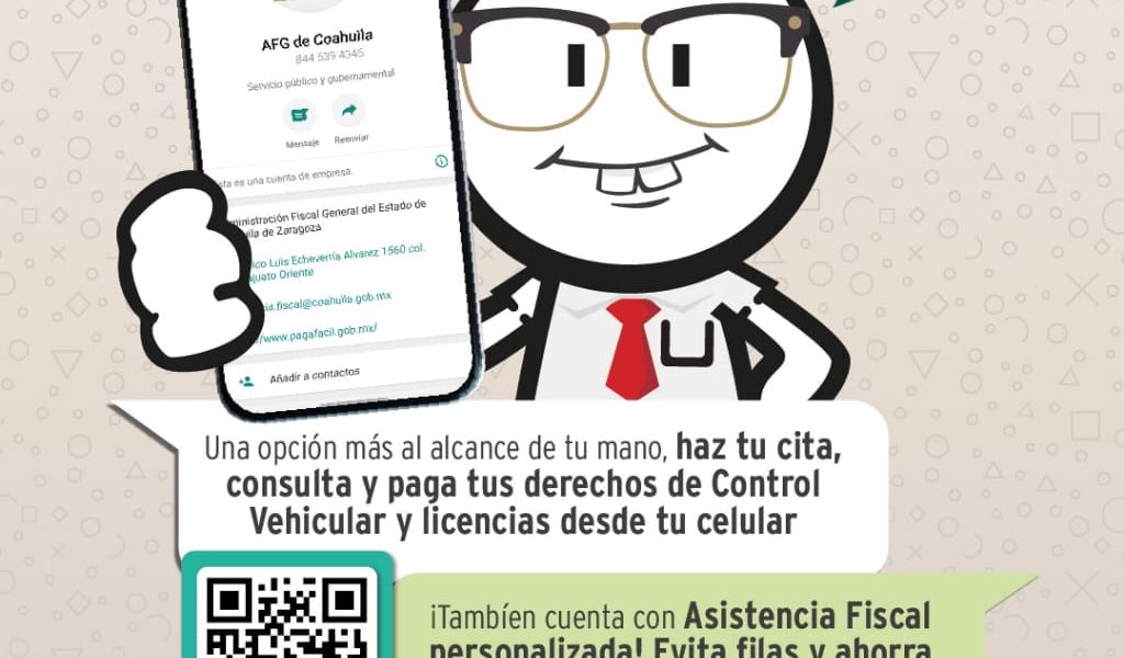 01 marzo 2023; Saltillo, Coahuila.- Envía un WhatsApp, consulta y realiza tus trámites de la Administración Fiscal General de Coahuila (AFG) desde la comodidad de tu celular.