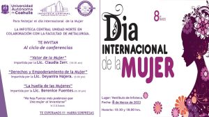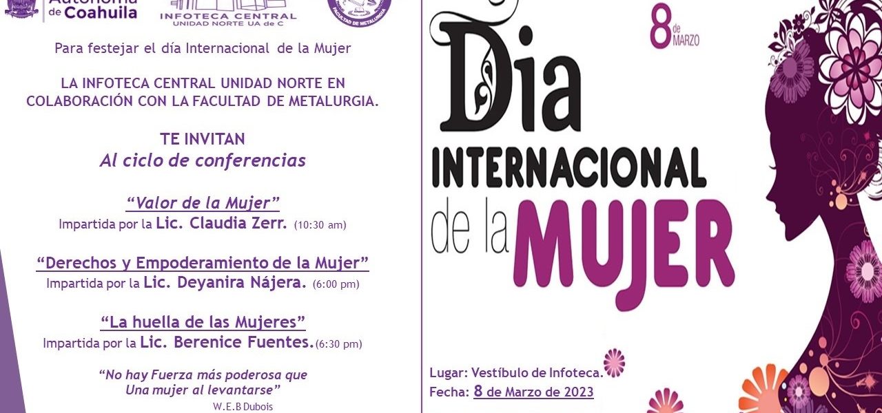 La Infoteca Unidad Norte y la Facultad de Metalurgia, invitan el 8 de marzo a un ciclo de conferencias que se desarrollará en el vestíbulo de la Infoteca, se impartirá: “Valor de la mujer” a cargo de la Lic. Claudia Zerr a las 10:30 horas, “Derechos y empoderamiento de la mujer” por la Lic. Deyanira Nájera a las 18:00 horas y “La huella de las mujeres” a cargo de la Lic. Berenice Fuentes a las 18:30 horas.