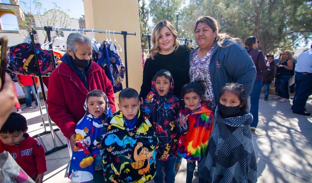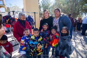 La Brigada Invernal del DIF Municipal también llegó al ejido Landeros con la entrega de 50 capas polares; 50 kits de limpieza y 70 cajas de pañuelos desechables.