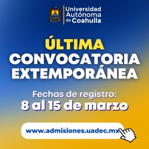 07 marzo 2023; Saltillo, Coahuila.- Si deseas estudiar en la Universidad Autónoma de Coahuila y no alcanzaste a tramitar la ficha para el examen de ingreso, la máxima casa de estudios abre del 8 al 15 de marzo un último período de expedición de fichas para ingresar a Bachillerato, Licenciatura y Posgrado para el semestre agosto-diciembre 2023.
