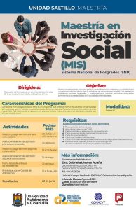 08 marzo 2023; Saltillo, Coahuila.- La Facultad de Psicología Unidad Saltillo de la Universidad Autónoma de Coahuila, convoca a egresados de las licenciaturas en ciencias sociales, ciencias de la conducta, humanidades o disciplinas afines, a estudiar la Maestría en Investigación Social, cuyas clases iniciarán en agosto 2023, los interesados registrarse en www.uadec.mx/admisiones.