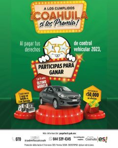 Recuerda que si realizaste tu Prepago 2023 en el mes de diciembre o bien al cubrir tu Control Vehicular 2023 antes del 31 de marzo del año en curso, participas automáticamente en el sorteo “A los cumplidos Coahuila sí los premia”, que consta de increíbles sorpresas, como una de dos casas nuevas en Torreón o Saltillo, uno de 15 autos último modelo o uno de 40 premios de 50,000 pesos.