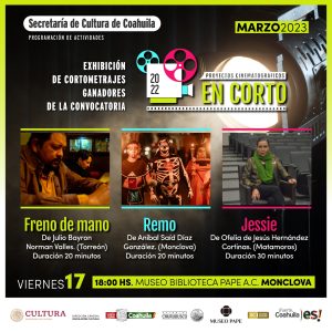 16 marzo 2023; Saltillo, Coahuila.- Como parte de las acciones que realiza la Secretaría de Cultura de Coahuila (SC) para promover el talento estatal, en este caso en el área del Séptimo Arte, se llevará a cabo la presentación de los cortometrajes ganadores de la convocatoria Proyectos Cinematográficos en Corto 2022.