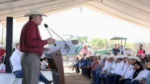 Acompañado del secretario de Desarrollo Rural del Gobierno del Estado, José Luis Flores Méndez, Chema Fraustro destacó el apoyo del mandatario Miguel Ángel Riquelme Solís con lo cual se hace posible duplicar los beneficios a toda la gente del campo saltillense.