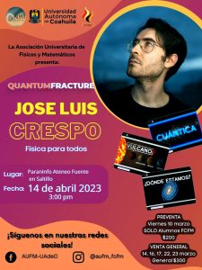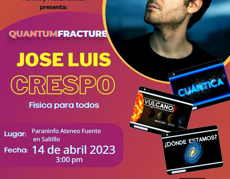 17 marzo 2023; Saltillo, Coahuila.- La Universidad Autónoma de Coahuila a través de la Facultad de Ciencias Físico Matemáticas (FCFM) y la Asociación Universitaria de Físicos y Matemáticos, invitan a la comunidad universitaria y público en general a la conferencia “Quantum Fracture: José Luis Crespo, física para todos” el día 14 de abril del 2023 a las 15:00 horas, en el Paraninfo del Ateneo Fuente.