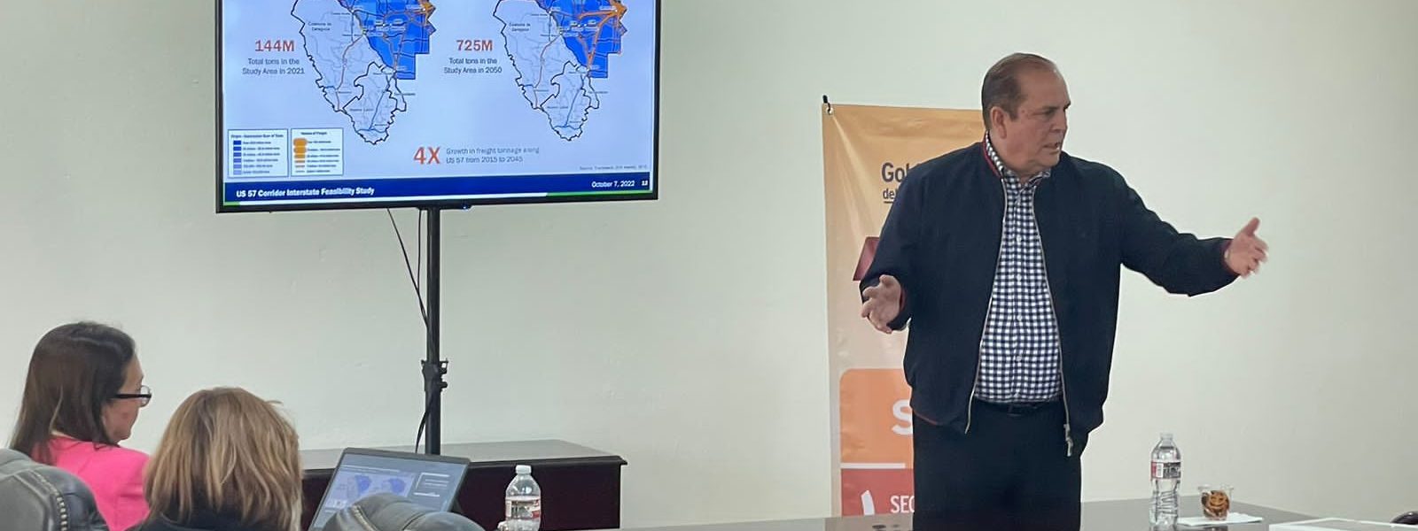 18 marzo 2023; Piedras Negras, Coahuila.- Por indicaciones del gobernador Miguel Ángel Riquelme Solís, el Secretario de Economía Claudio Bres Garza, se reunió con empresarios transportistas, agentes aduanales, miembros de la Iniciativa Privada y representantes de empresas, en las instalaciones del Consejo de la Industria de Exportación (INDEX), para presentar avances de remodelación de puertos fronterizos de Piedras Negras en Puentes internacionales I y II.