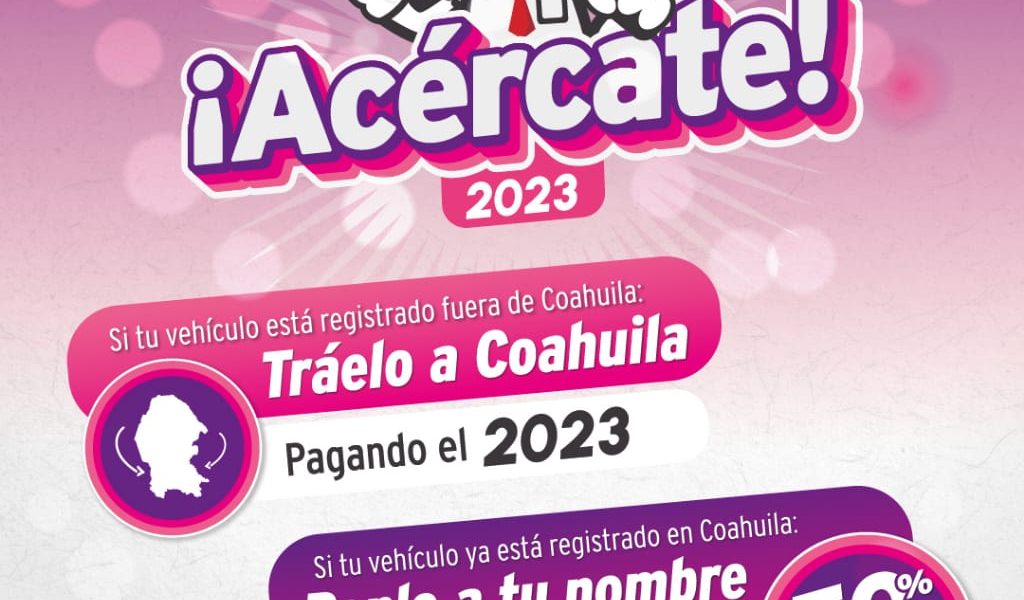Mientras que en el caso de que tu vehículo esté registrado fuera del Estado, “Tráelo a Coahuila” y solo paga el Ejercicio Fiscal 2023, se condona al 100 por ciento de ejercicios anteriores.