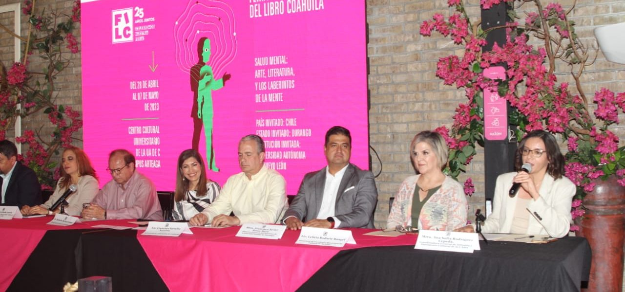 01 Abril 2023; Saltillo, Coahuila.- La Feria Internacional del Libro de Coahuila, en su XXV Edición, tendrá como invitados de honor a Chile, Durango y a la Universidad Autónoma de Nuevo León; su eje rector será “Salud Mental: Arte, Literatura y los laberintos de la mente”, y se llevará cabo del 28 de abril al 7 de mayo en el Centro Cultural Universitario de la UAdeC, Campus Arteaga.
