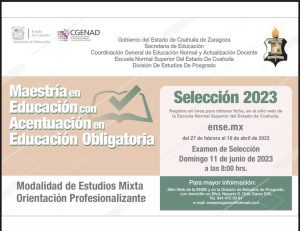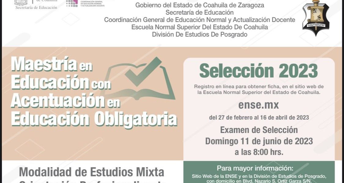 10 Abril 2023; Saltillo, Coahuila.- El registro para inscribirse a la maestría en Educación con Acentuación en Educación Obligatoria que oferta la Escuela Normal Superior del Estado (ENSE) permanecerá abierto hasta el 16 de abril, para aplicar el examen de selección en el mes de junio.