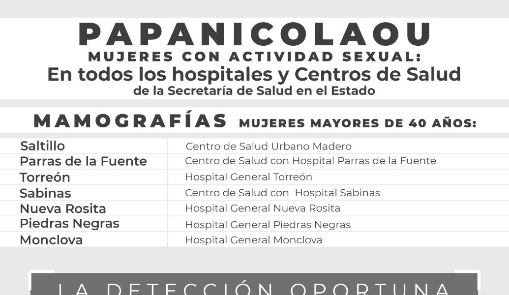 19 Abril 2023; Saltillo, Coahuila.- Gobierno del Estado, a través de su Secretaría de Salud, recordó a la población que los centros de salud públicos de las 8 Jurisdicciones Sanitarias de la entidad mantienen activas de manera permanente la campaña de detección oportuna de cáncer de mama y virus del papiloma humano.