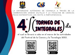 13 Mayo 2023; Saltillo, Coahuila.- La Universidad Autónoma de Coahuila a través de la Coordinación Unidad Saltillo (CUS) y de la Facultad de Ciencias Físico Matemáticas (FCFM), invitan a la comunidad estudiantil de la Unidad Saltillo a participar en el Cuarto Torneo de Integrales y en el Segundo Torneo de Derivadas, en el marco del Festival de la Ciencia y la Tecnología 2023 organizado por la Facultad.