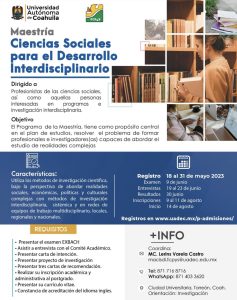 17 Mayo 2023; Torreón, Coahuila.- La Universidad Autónoma de Coahuila a través de la Facultad de Ciencias Políticas y Sociales Unidad Torreón, ofrece la Maestría en Ciencias Sociales para el Desarrollo Interdisciplinario, para ingresar en el semestre agosto-diciembre 2023, la inscripción deberá de realizarse en www.uadec.mx/admisiones/.