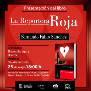 18 Mayo 2023; Saltillo, Coahuila.- La Universidad Autónoma de Coahuila a través de la Coordinación de Difusión y Patrimonio Cultural (DPC), invita a la comunidad universitaria y el público en general a la presentación del libro “La Reportera Roja” del autor Fernando Fabio Sánchez, el próximo 25 de mayo a las 18:00 horas en el Recinto del Patrimonio Cultural Universitario, ubicado en la calle Miguel Hidalgo, número 211 en el Centro Histórico de Saltillo.