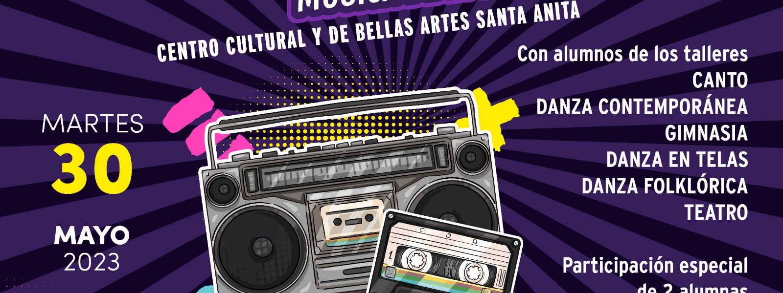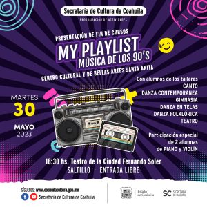 Por su parte, el Centro Cultural y de Bellas Artes “Santa Anita”, de esta ciudad, tendrá su presentación de fin de cursos con el musical titulado «Mi playlist», en la que se tendrá una interesante demostración de talento acompañada de música de los 90’s.