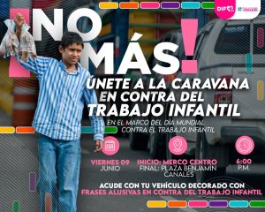 Nancy Liliana Cazares Carrillo, titular de la PRONNIF, confirmó que, previo al Día Mundial Contra el Trabajo Infantil -12 de junio- realizarán esta Caravana, a partir de las 6 de la tarde, del estacionamiento de Merco Centro, con recorrido por la avenida Guerrero hacia la plaza Benjamín Canales.