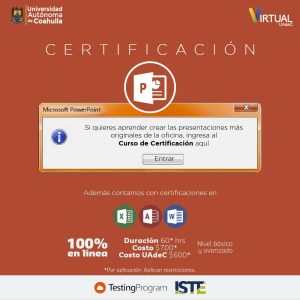 10 Junio 2023; Saltillo, Coahuila.- La Coordinación General de Educación a Distancia de la Universidad Autónoma de Coahuila, invita a certificarse internacionalmente en Microsoft Office a través de la plataforma Testing Program, el costo del curso por aplicación para el público en general es de $700 pesos y para trabajadores y estudiantes de la institución es de $600 pesos.