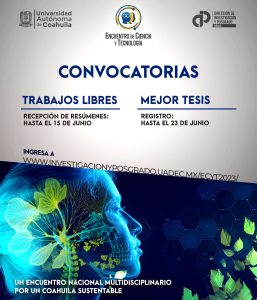 14 Junio 2023; Saltillo, Coahuila.- La Universidad Autónoma de Coahuila a través de la Dirección de Investigación y Posgrado convocan a la comunidad científica y académica a registrar sus trabajos para participar en el premio a la Mejor Tesis y Trabajo Libre en el “Encuentro de Ciencia y Tecnología 2023: Un Encuentro Nacional Multidisciplinario por un Coahuila Sustentable” (ECyT 2023), que se llevará a cabo el 7 de septiembre de 2023 en las instalaciones del Campus Arteaga.
