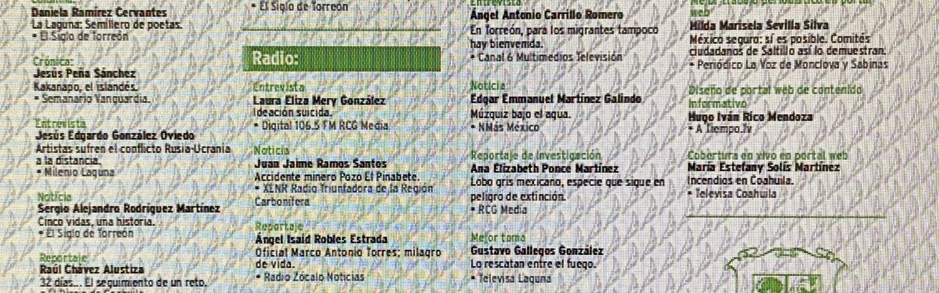 La Coordinación General de Comunicación e Imagen Institucional del Estado, a cargo de Fernando Simón Gutiérrez Pérez, dio a conocer la lista de las y los triunfadores del certamen con que el Gobierno de Coahuila reconoce la calidad y la excelencia del trabajo de los hombres y mujeres que diariamente ejercen la noble profesión del periodismo.